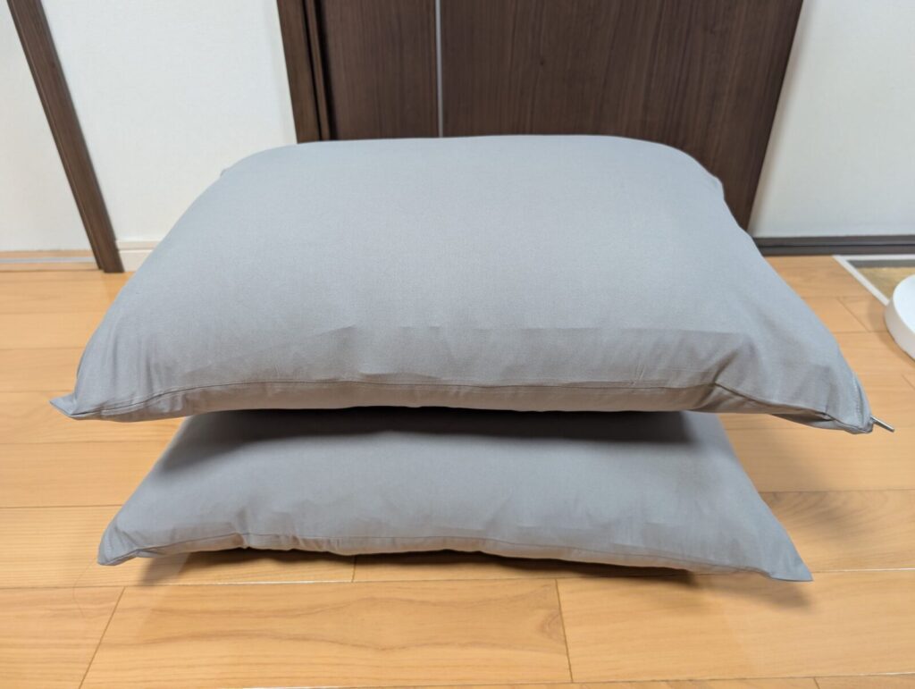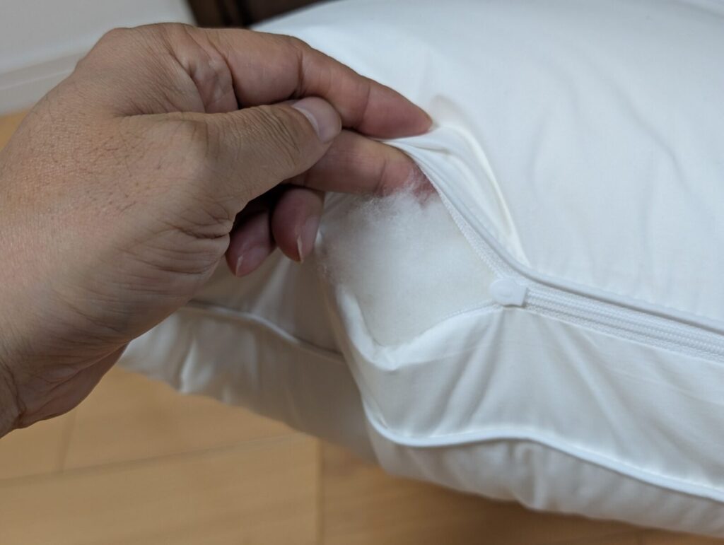 ホテルの枕のような適度な反発力があり、ヘタりにくいのが特徴。ただ、届いた状態だと私には少し高すぎたので、中材(綿)を少し抜いて高さを調整しました。自分好みにカスタマイズできて、この価格は素晴らしい!