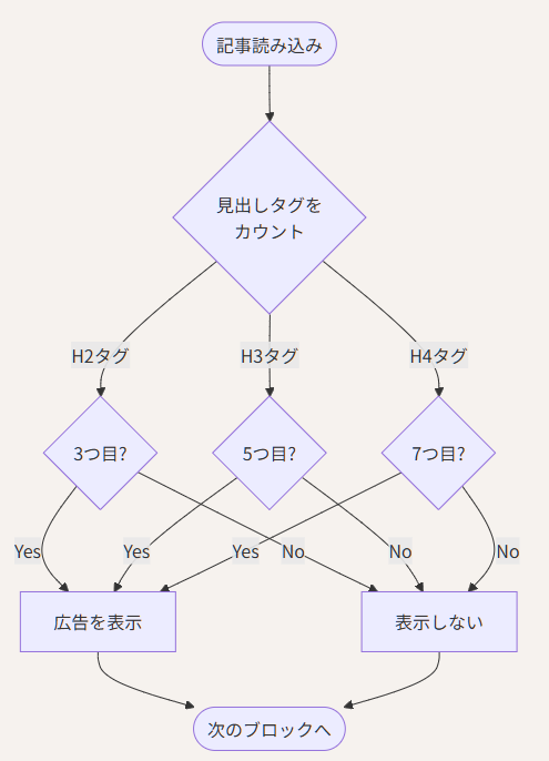 これにより、短い記事では広告が少なく、長い記事では適度な休憩ポイントとして機能するように調整しています。