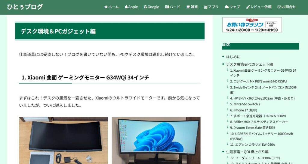 これまでは目次のみを表示していましたが、その上部に「楽天のおすすめ商品・キャンペーン情報」を配置しました。記事の閲覧エリア(メインカラム)を侵食せず、かつお得な情報が自然と目に入るレイアウトに変更しています。