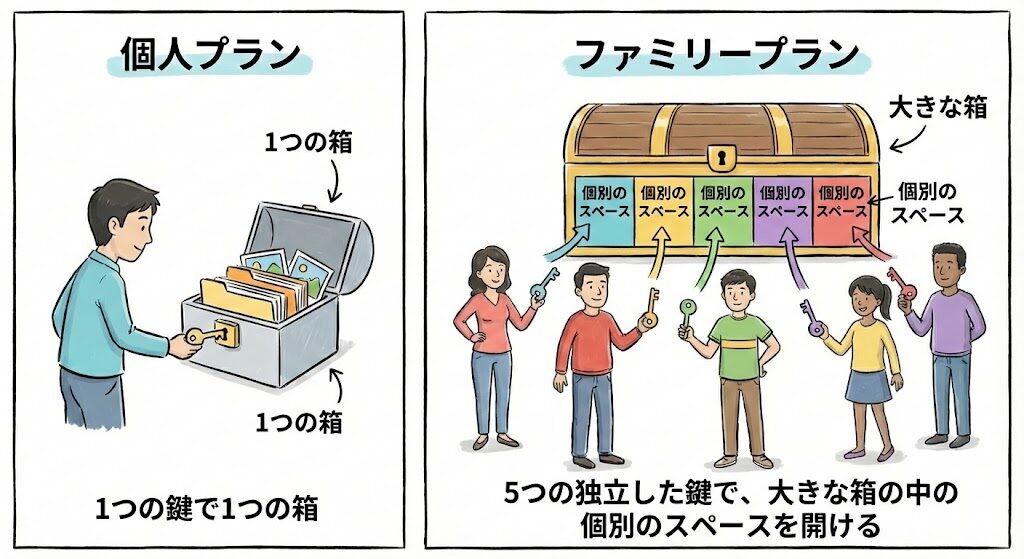 ファミリープランであれば、最大5人のメンバーが自分たちのプライバシーを守りつつ、それぞれが独立したアカウントで「サブスク不要のストレージ」を持つことができます。