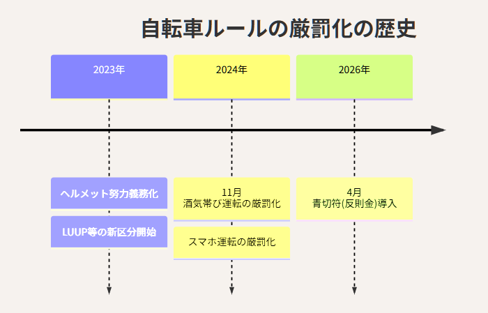 まずは、ここ数年の自転車ルールの厳罰化の流れを見てみましょう。