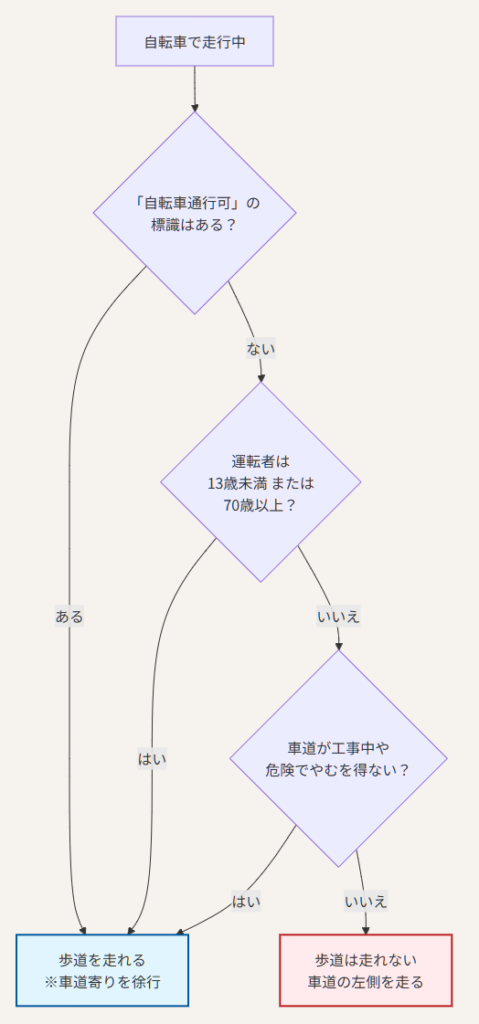歩道を走って良い条件は非常に限定されています。以下のフローチャートで確認してみてください。