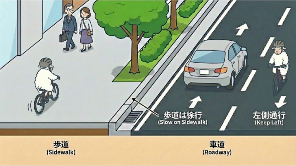 自転車はキープレフト(左側通行)が絶対です。「歩道がないから」という理由は通用しません。車道の右側を走ることは、対向車に向かって突っ込む自殺行為とみなされます。