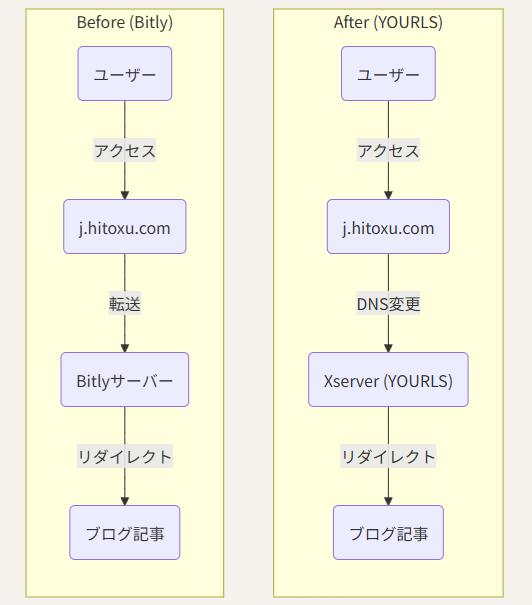 j.hitoxu.com の向き先(DNS)をBitlyからXserverに変えるだけで、URLの文字列を変えずにシステムだけを入れ替えることが可能です。