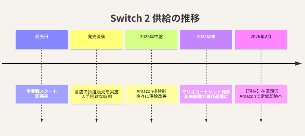 発売以降、長らく入手困難が続いていた「Nintendo Switch 2」ですが、2026年2月に入り、ついにAmazonでの在庫が潤沢になりました。