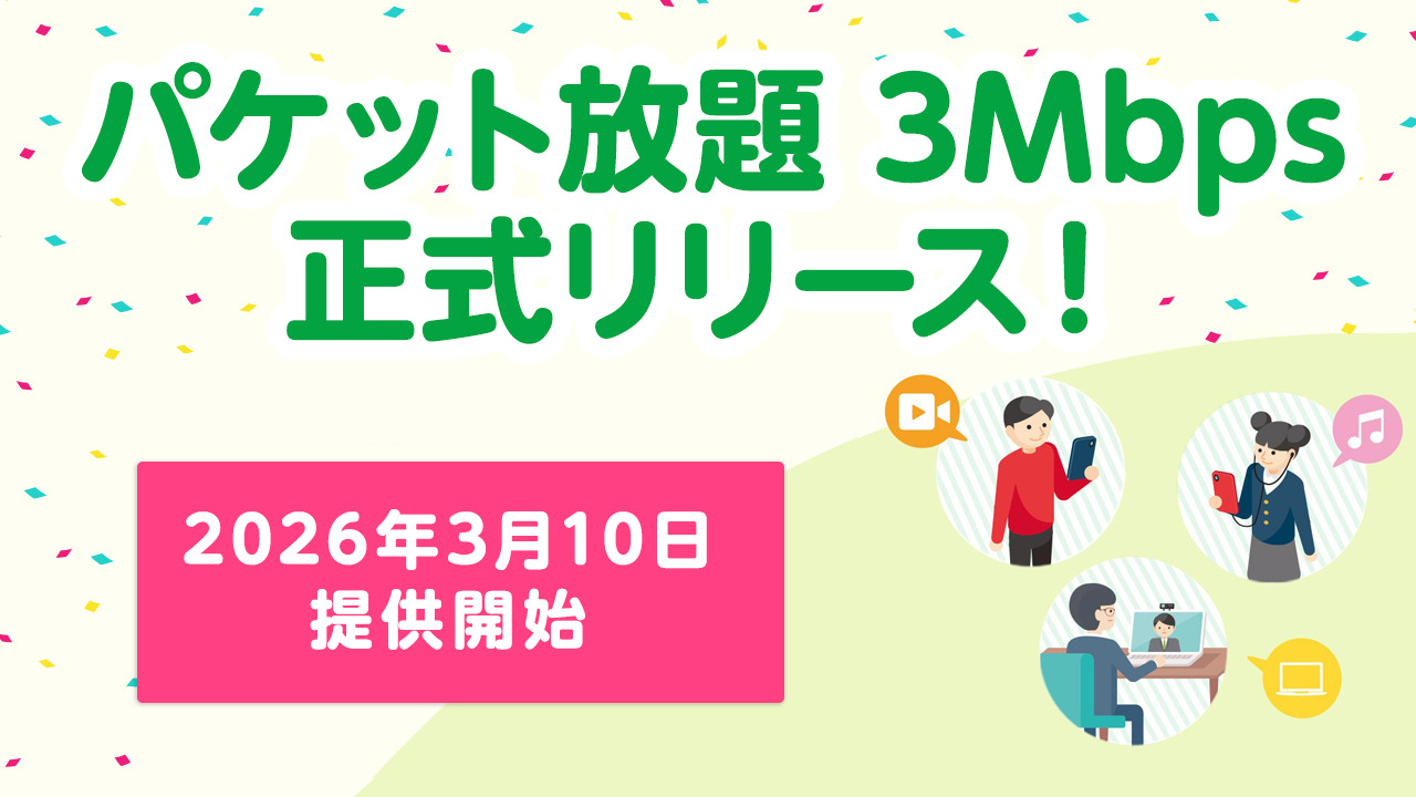 これまでの1.5MbpsでもSNSや標準画質の動画は視聴できましたが、最大通信速度が3Mbpsに増速されたことで、高画質動画の再生やアプリのダウンロードなど、日常使いの快適さが劇的に向上します。しかも、オプション料金は月額385円のまま据え置きです。