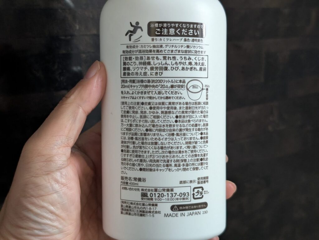 常備浴は1本400ml入りです。1回の入浴で20mlを使用するため、1本で約20日分(20回分)という計算になります。 1本約4,000円とすると、1回あたりのお値段は約200円。市販の入浴剤と比べると、なかなかの高級品ですよね。