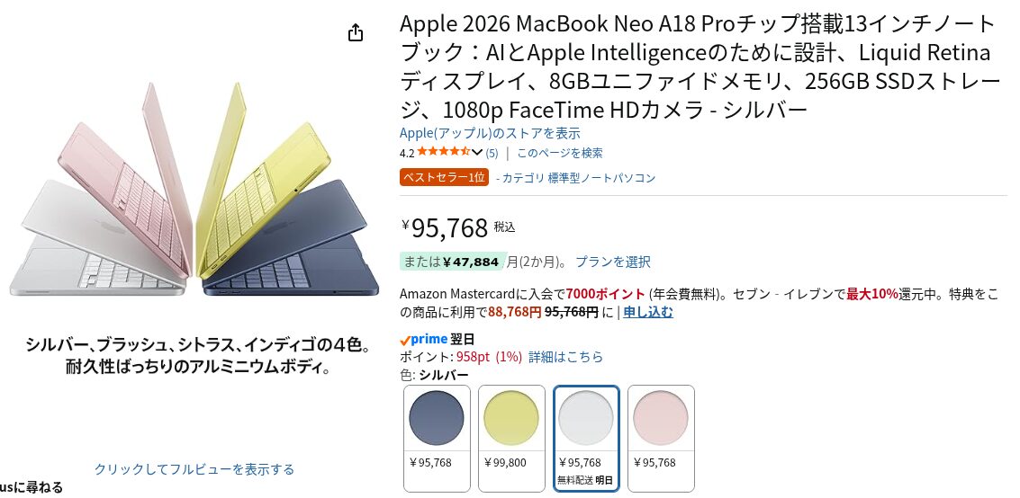 最大のトピックは、なんと言っても「10万円を切る」その圧倒的な価格設定。今回は、話題沸騰中のMacBook Neoの基本スペックと、Amazonを活用して定価よりさらにお得に購入する方法をご紹介します!