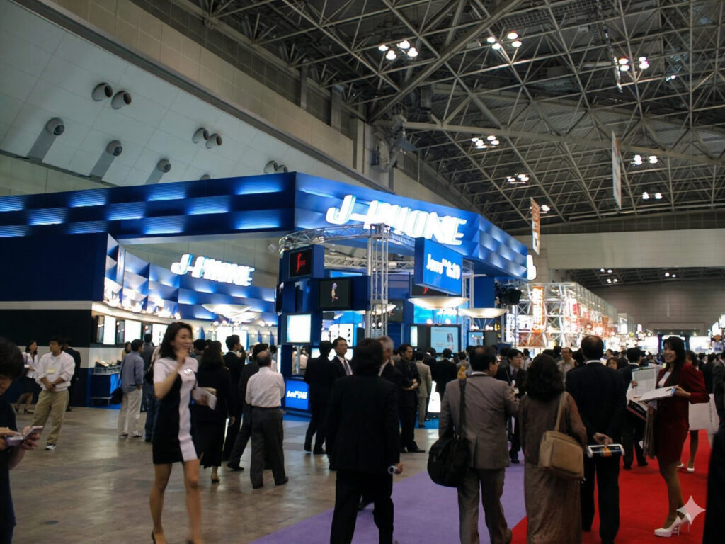 こちらは昔のイベント会場を撮影した写真です。奥には懐かしの「J-PHONE」のブースが見えますね。当時のカメラ性能のためか、全体的に解像度が低く、人の顔や看板の文字がブレてぼやけてしまっています。
